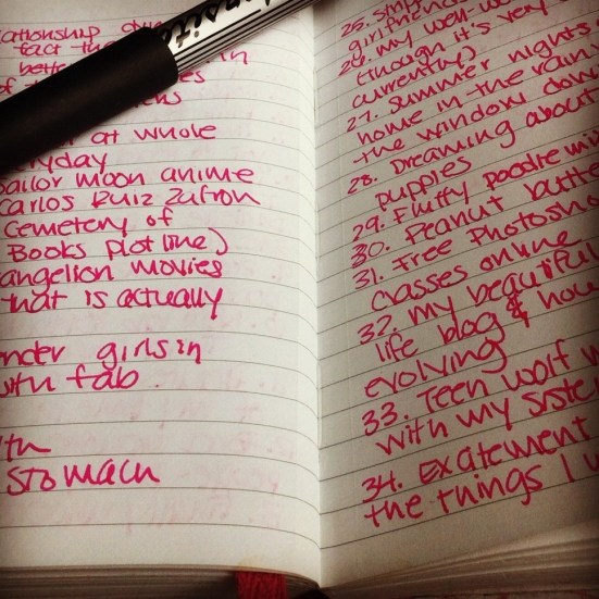 Rain is great, but I don’t like humidity. During the day, I’ve been feeling really blah  and disinclined to move. To get myself out of my funk this morning (anytime I reach Day 3 of a funk, I know it’s time for desperate measures), I pulled out my pink moleskin and did something I haven’t done in a while: wrote about stuff I’m thankful for. The photo above is my actual list from this morning.