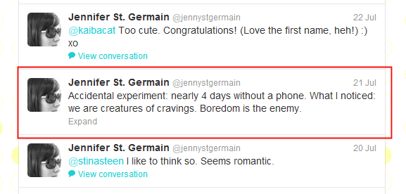 On day 2, I was a little antsy. I couldn’t check twitter or play Draw Something. My texts went off into some beautiful void somewhere, never to be received by me. My facebook feed went unchecked.