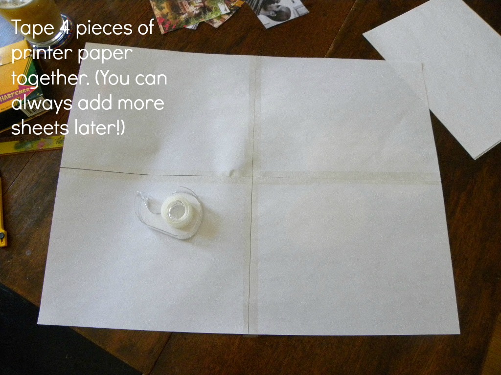 “Where’s the posterboard?” you might be asking. Ah, dear reader, this is SMALL life, Slow Life – good ol’ printer paper taped together will do. There is seriously no need to  spend even a single dollar on this project!