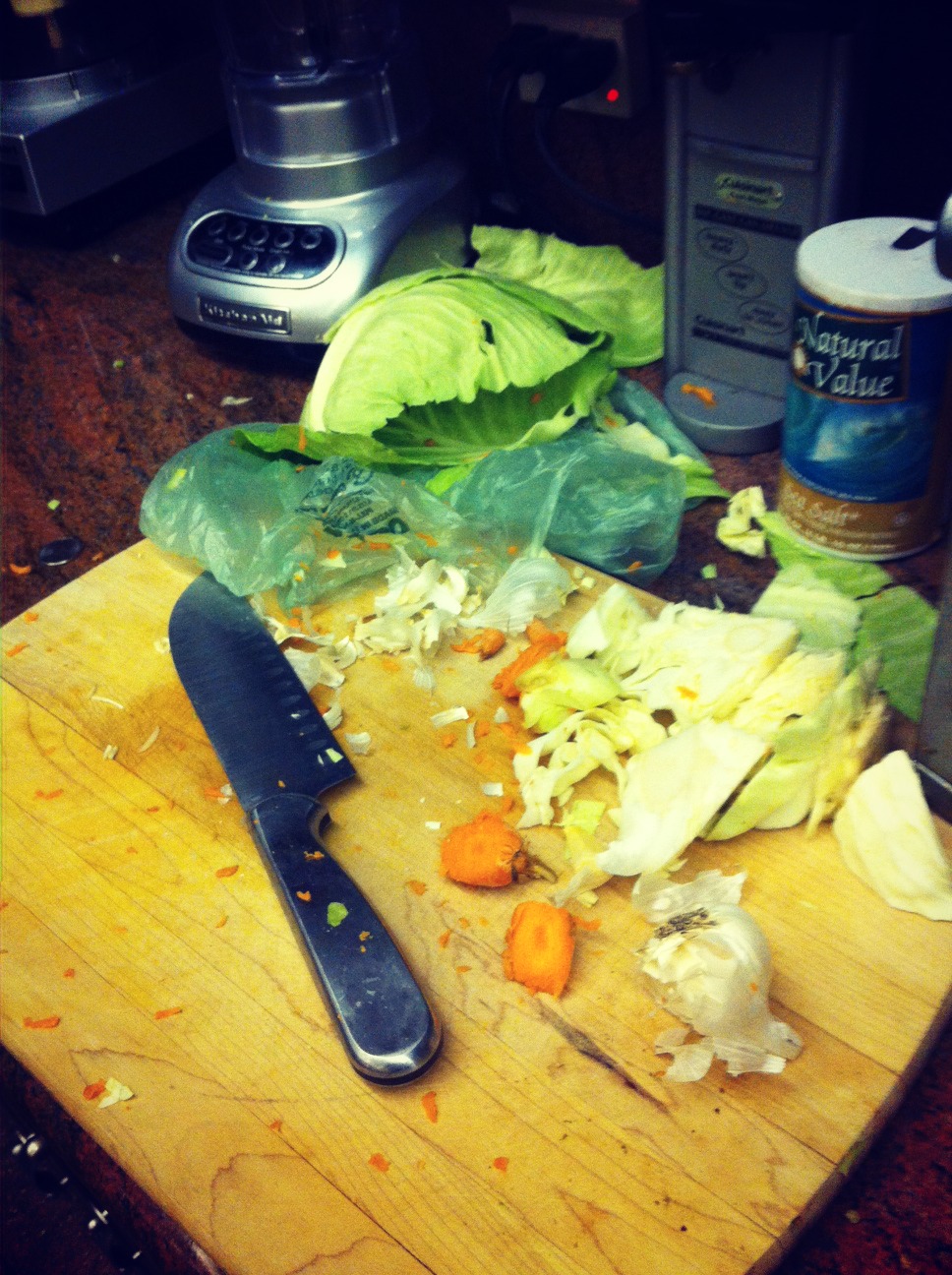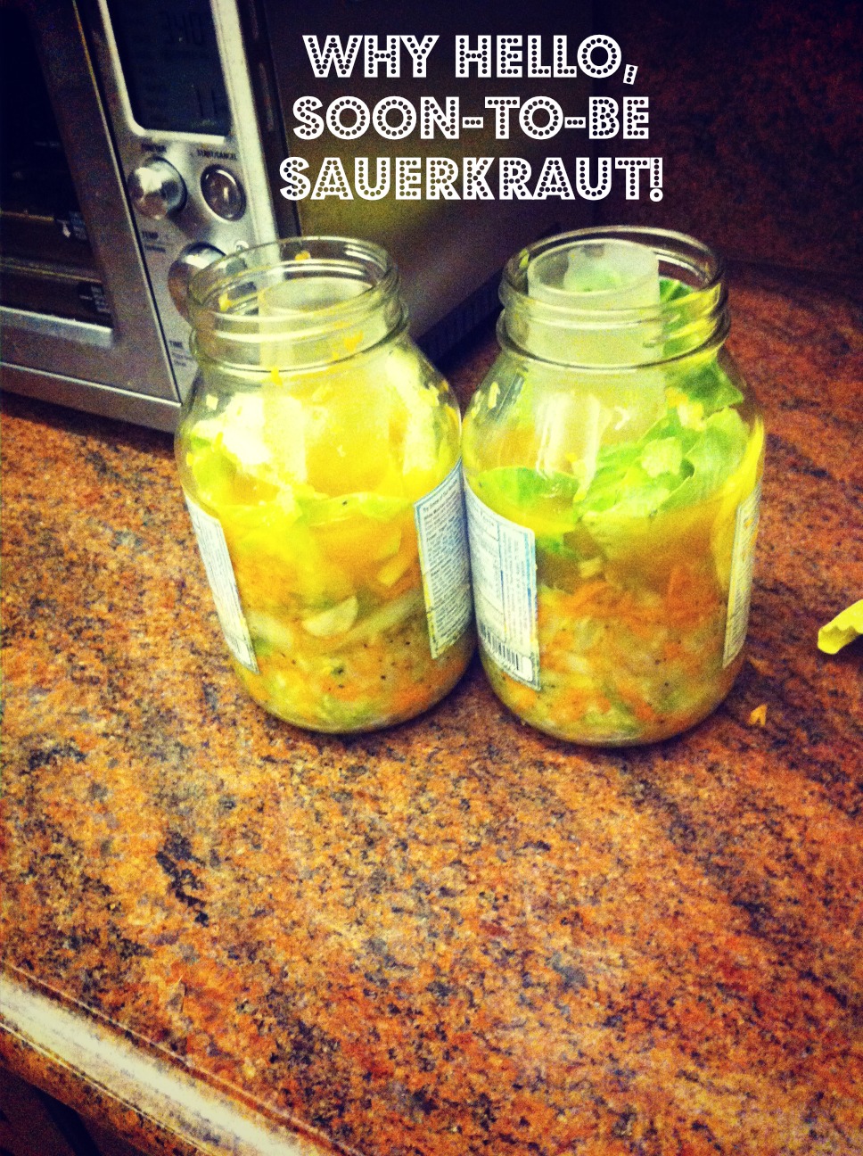 In case you want to try this insane kitchen science project, the sauerkraut recipe called for one head of cabbage, two large carrots, one jalapeno and four cloves of garlic. You’ll also need two 32-ounce mason jars and one very large mixing bowl.
