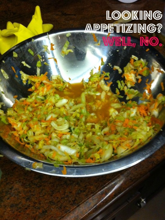 Then take your cabbage leaves you set aside and smoosh (yep, smoosh) them on top of the whole mixture, sealing off the chopped veggies from the air. It took me a while to do this, and I, in a silly fashion, did not use mason jars but glass containers we’d gotten yogurt in. If I were you, I’d use the mason jar because the mouth is wider which comes in handy later.