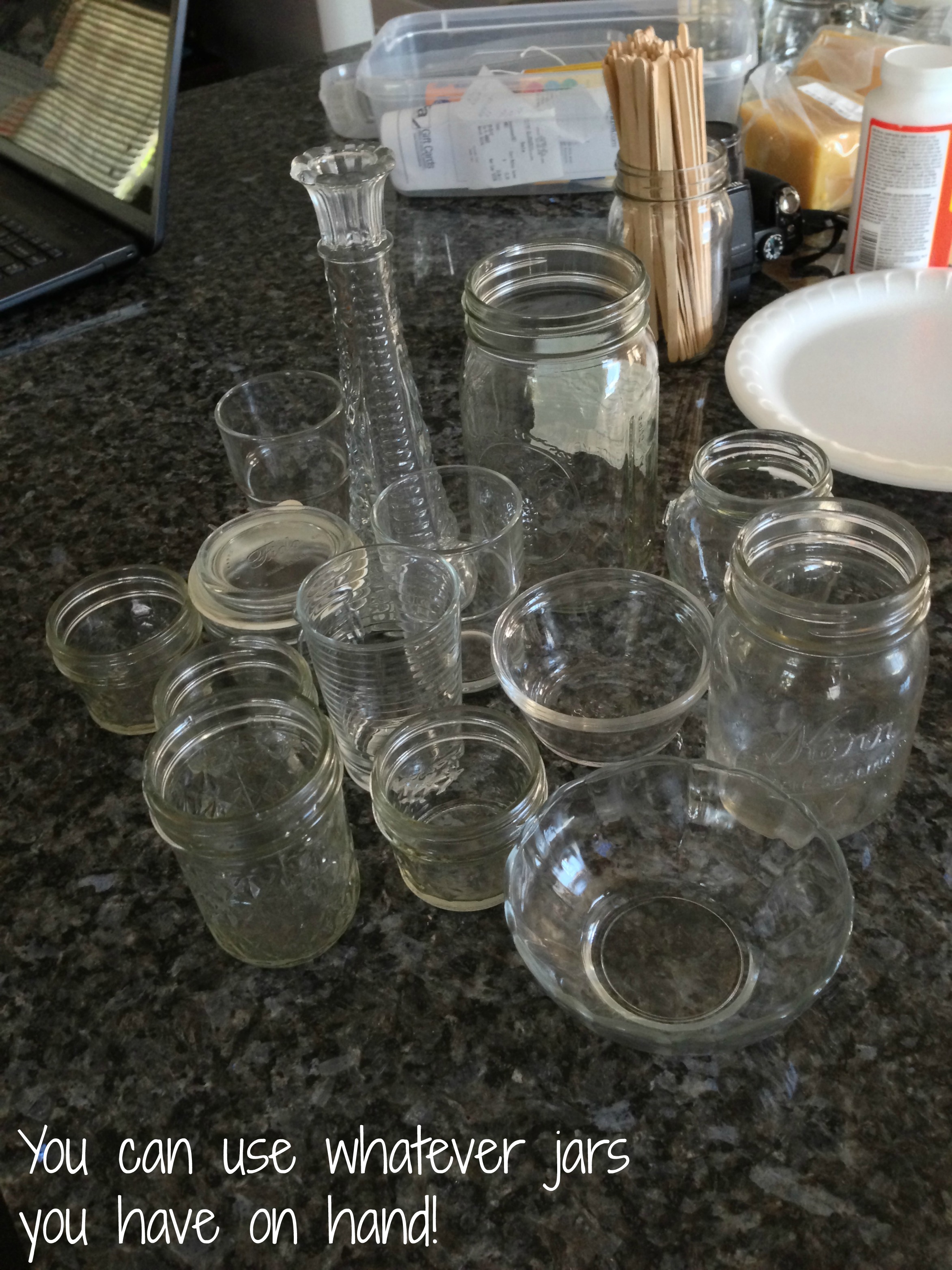 Gather the jars you want to use. A variety is fun, or plain old mason jars will work just fine. I went to a restaurant supply store and bought glass salt and pepper shakers and a bud vase to try out. Total cost? About $3!