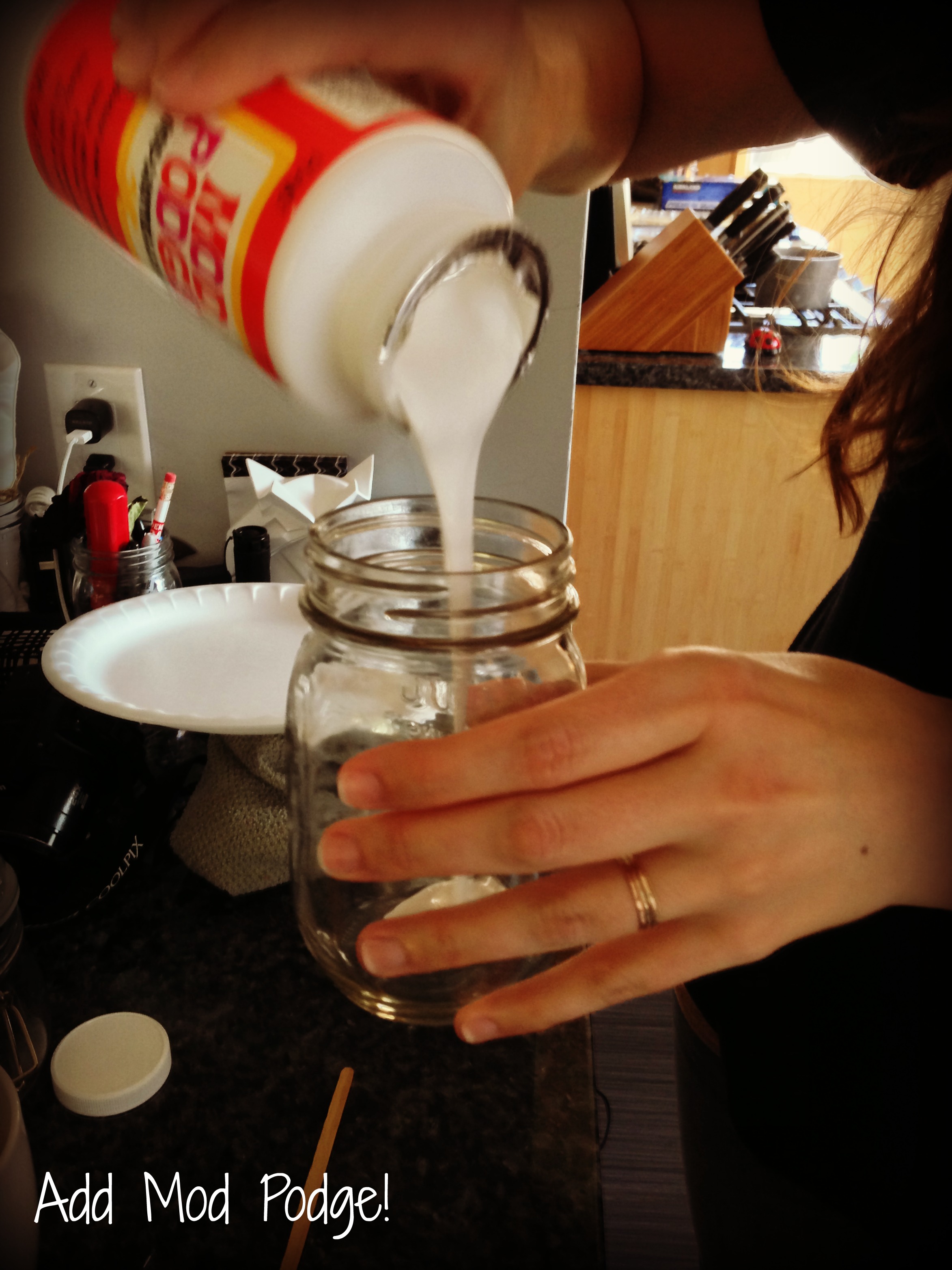 To begin, take the first jar you want to use and add the Mod Podge to the bottom. Just pour it on in. Some websites told us to use about two tablespoons, but I think I used a bit more in my jars. Some websites also said that adding a tiny (like, a teaspoon or less) amount of water can help the Mod Podge roll around smoothly. We did not do that, though I would consider trying it next time.