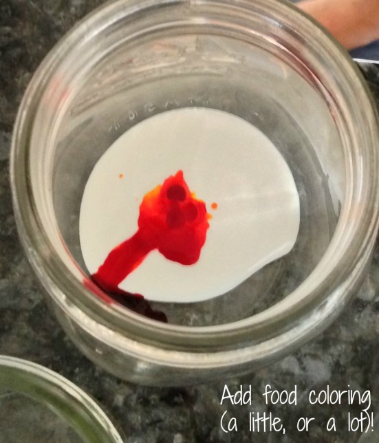Next, you’ll add your food coloring. Darcy picked out some pretty colors, but feel free to mix up your colors too. I think the prettiest jar of the bunch was a turquoise one that Darcy mixed herself with  blue and green.