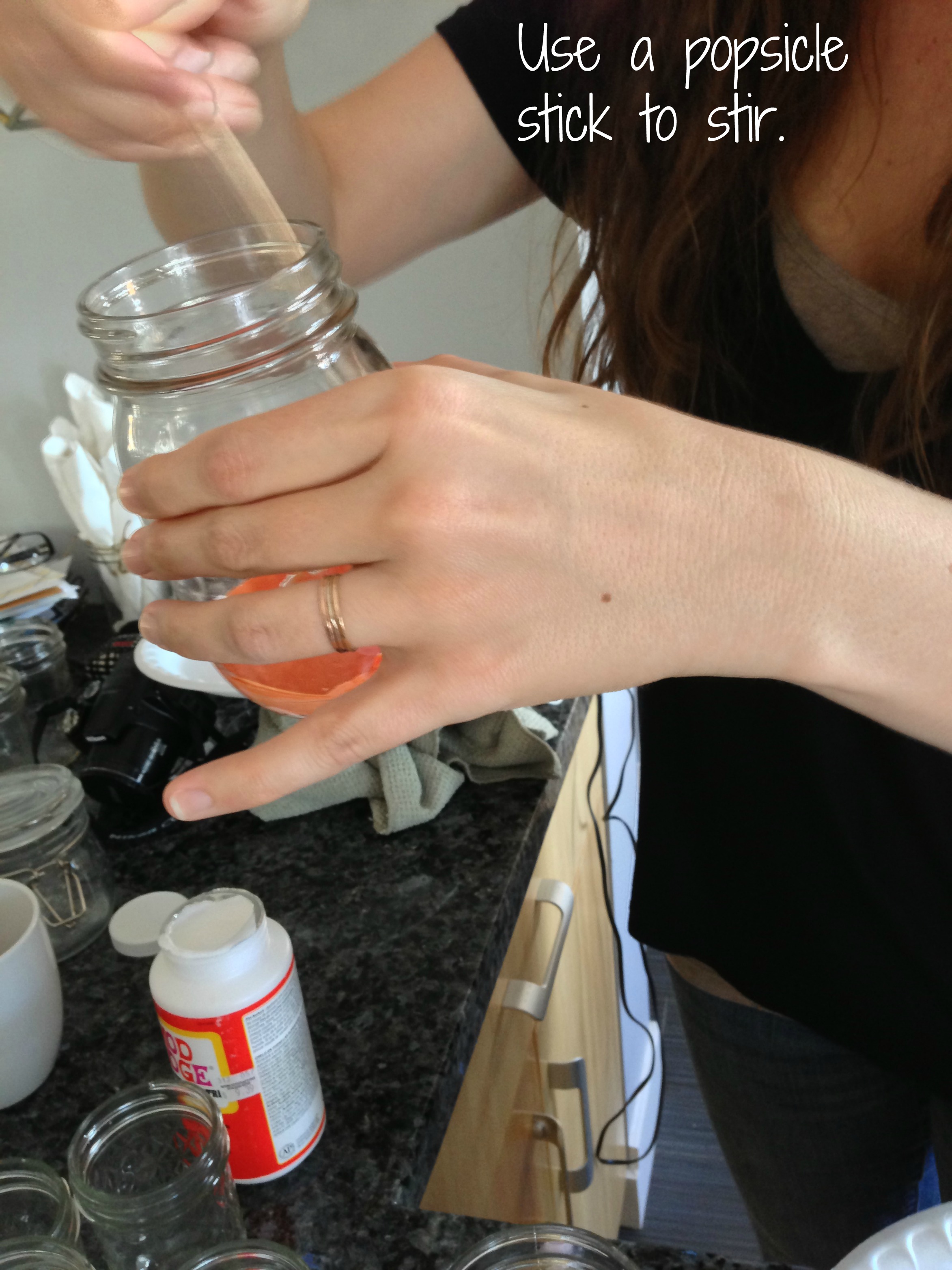 Use a popsicle stick to mix your food coloring and Mod Podge. Mix it really well – you want a nice, even color. Unmixed color/glue will show up as streaks in your final product.
