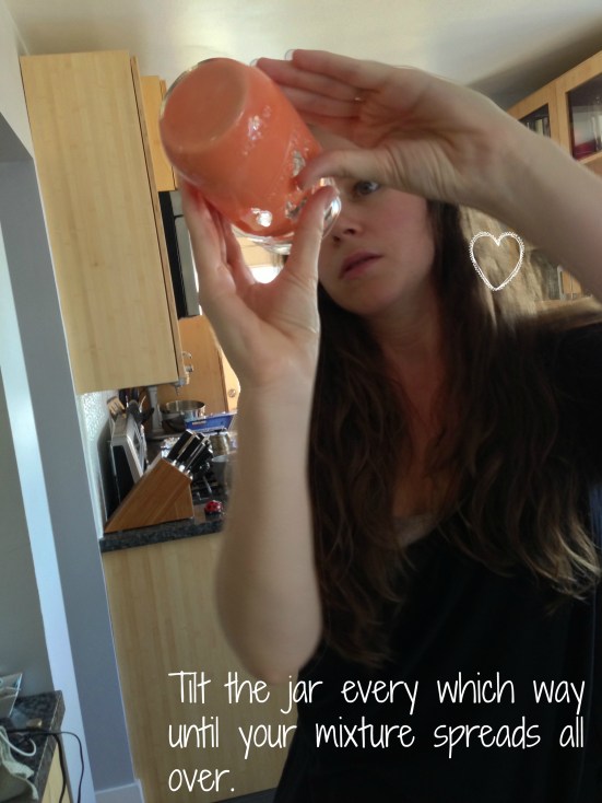 Now, it’s time to tilt the jar so that your mixture covers all of the inside. This is where you’ll find out if you used too little Mod Podge, or too much. You can correct at this stage by adding more Mod Podge if you need to.
