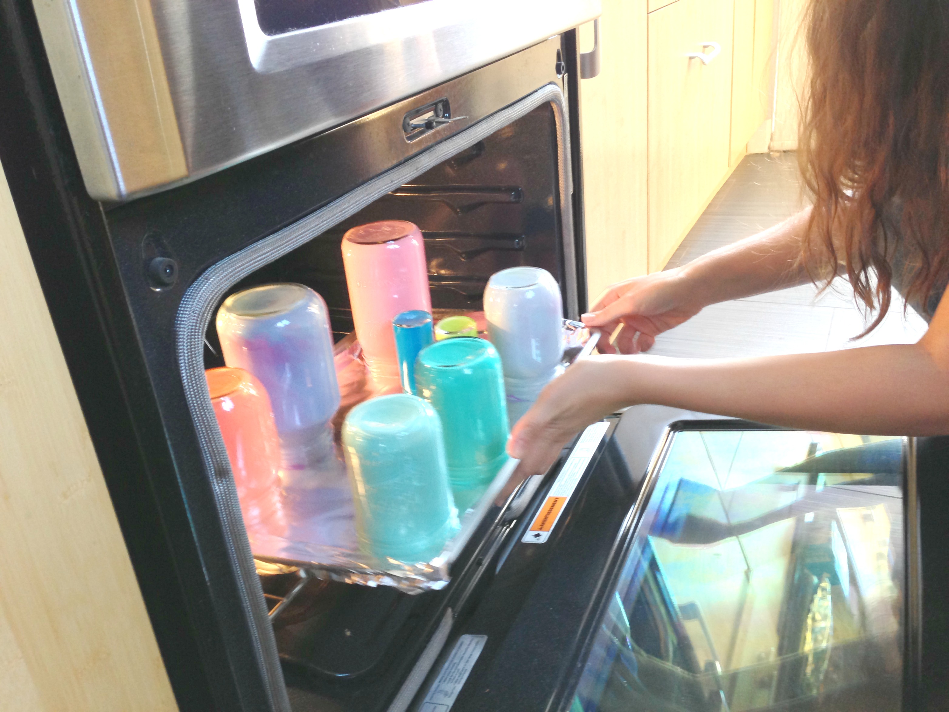 Put your jars upside down on a foil-lined baking sheet (you don’t want glue on your baking sheet; it’ll never come off). Place in a pre-heated 200-degree oven.