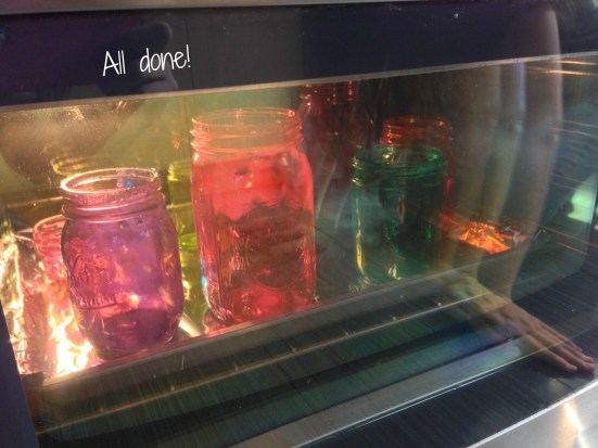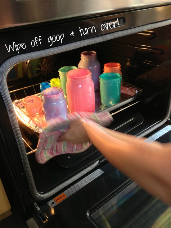 After about 2o total minutes, you’ll be able to tell that your jars are done. If there are any streaks or bubbling goo, you can leave them in a bit longer. We left one batch in for almost 40 minutes, so don’t sweat it if you think they need more time. Just make sure you turn them over halfway through so you don’t end up with a dud.