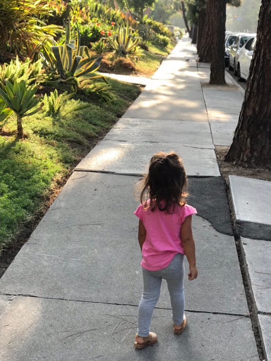 It amazes me how much she remembers from walks we took as long as six months ago. (We were doing family walks every day for a spell, but it’s been much too hot lately.) She checks to see if the sprinklers are on (such a happy occurrence if they are). She points out the same flowerbeds and comments on the color of the flowers. These two random trees (among literally a hundred trees that we pass) are her favorites and she asks if she can see the “nuts” on them (little seed pods).