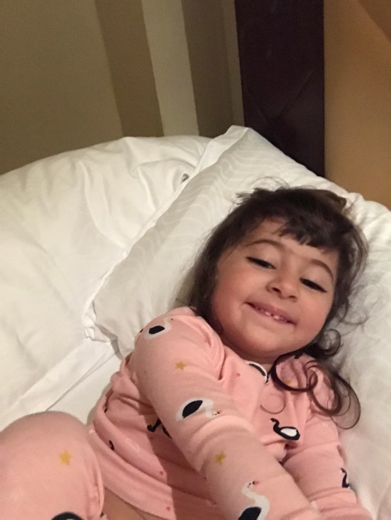 I was so nervous about getting her up at 4:45am, the drive to the airport, the five hour flight, and the car trip to the hotel. V is two, thus, she is not patient. At all. Ever.