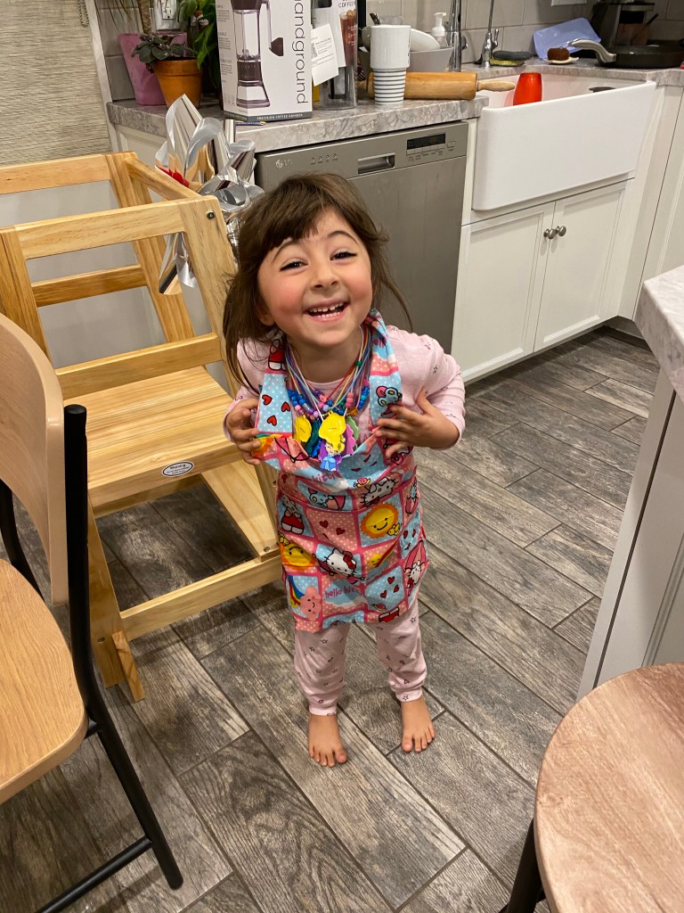 She asked for a step stool for Christmas! And I spent many nights hand-sewing this Hello Kitty apron for her. (I have a sewing machine but I just find sewing by hand more relaxing!)