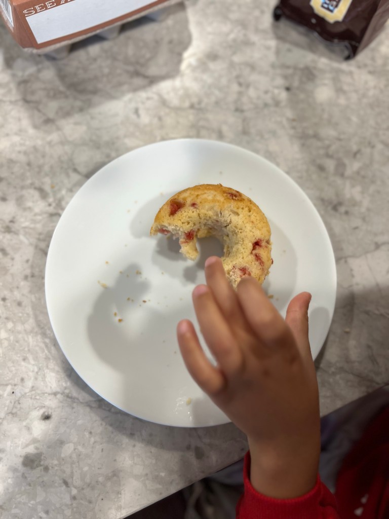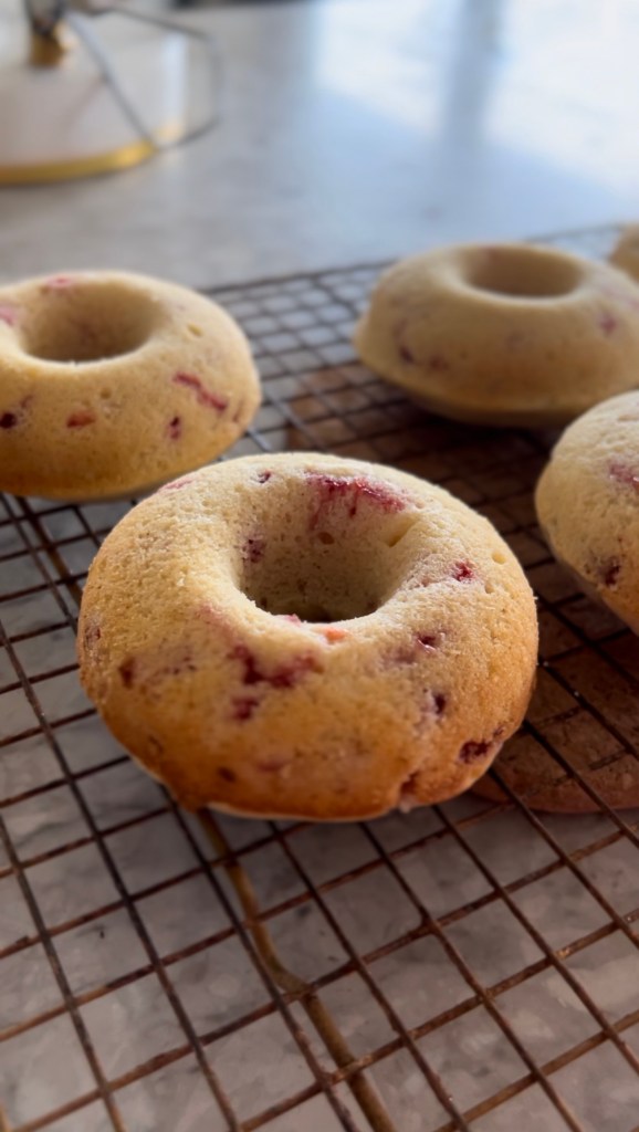 Before you come at me saying, “These didn’t taste like donuts,” I’m here to say: nothing but a donut tastes like a donut, sadly. If it’s not fried, made with wheat flour, or glazed — it’s NEVER going to taste like a real donut. If you go in thinking that these are delicious strawberry muffins in the shape of cute donuts, you’ll be much happier. 🙂🍓